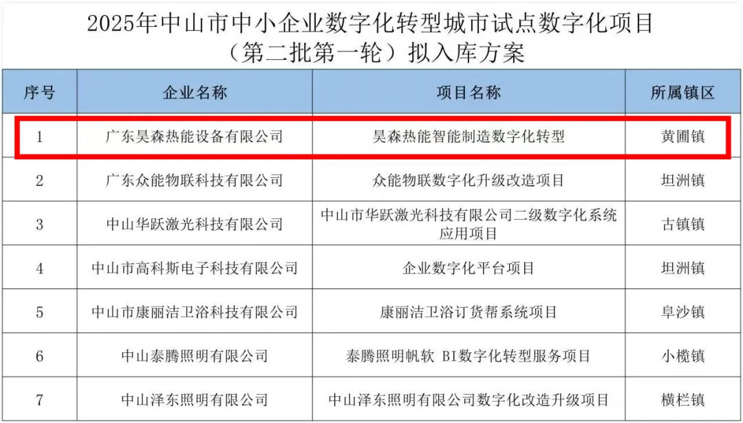 继标杆示范企业认证后,昊森热能再添重磅荣誉 —— 成功入选 “2025 年中山市中小企业数字化转型城市试点企业” 名单。这一突破不仅是对双方联合转型实践的再次权威背书,更标志着昊森从 “企业标杆” 升级为中山城市试点建设的 “核心样本”,其转型路径将形成可复制、可推广的 “昊森方案”,为全市中小企业数字化转型提供实操参考。